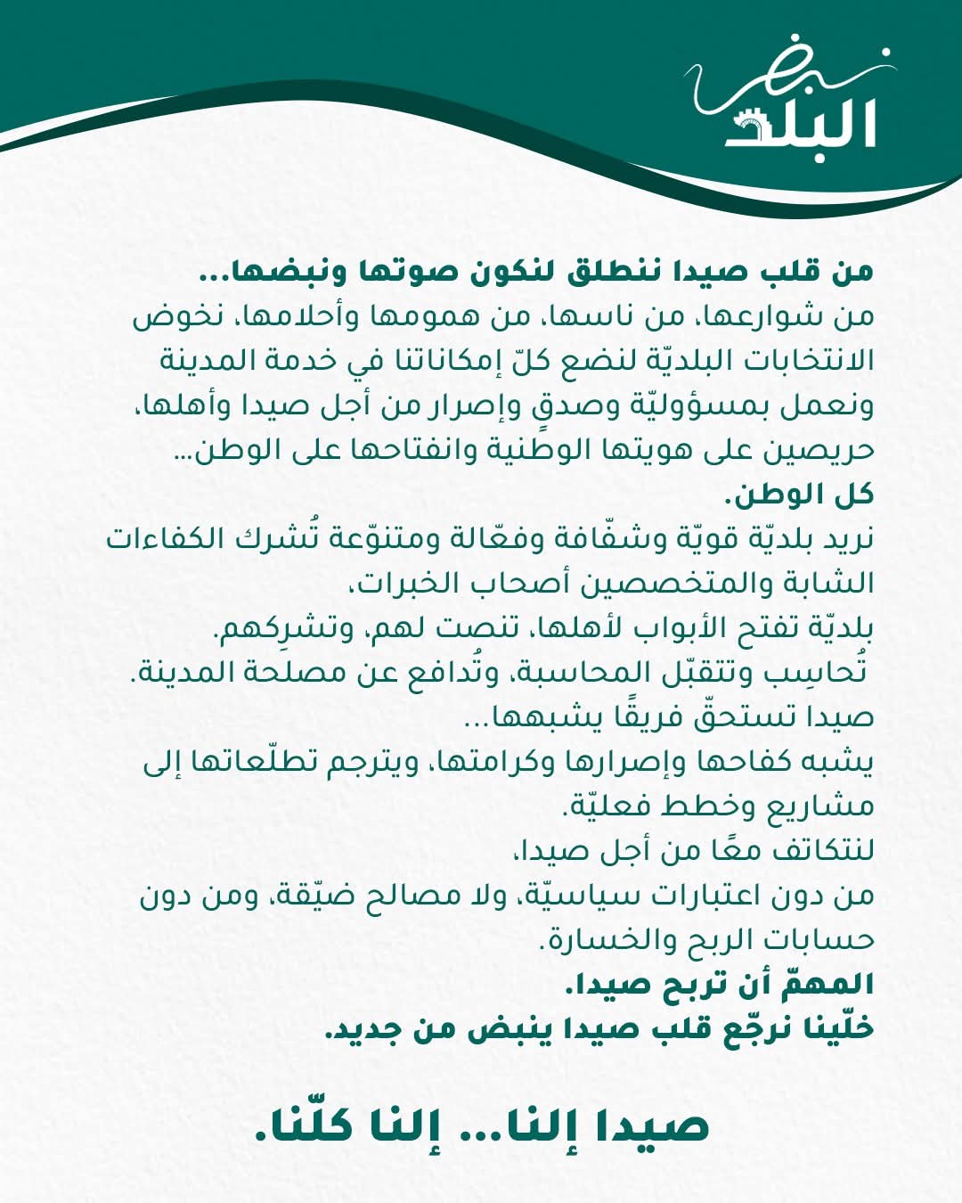 لائحة 'نبض البلد' برئاسة المهندس محمد الدندشلي تُعلن عن أسس البرنامج الإنتخابي لخوض إنتخابات بلدية صيدا
