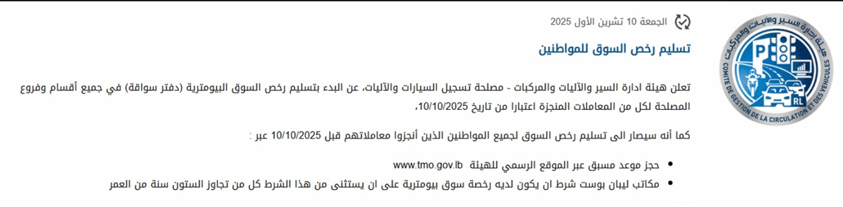 تعلن وزارة الداخلية والبلديات -هيئة ادارة السير والآليات والمركبات - مصلحة تسجيل السيارات والآليات، عن البدء بتسليم رخص السوق البيومترية في جميع أقسام وفروع المصلحة لكل من المعاملات المنجزة اعتبارا من تاريخ 10/10/2025