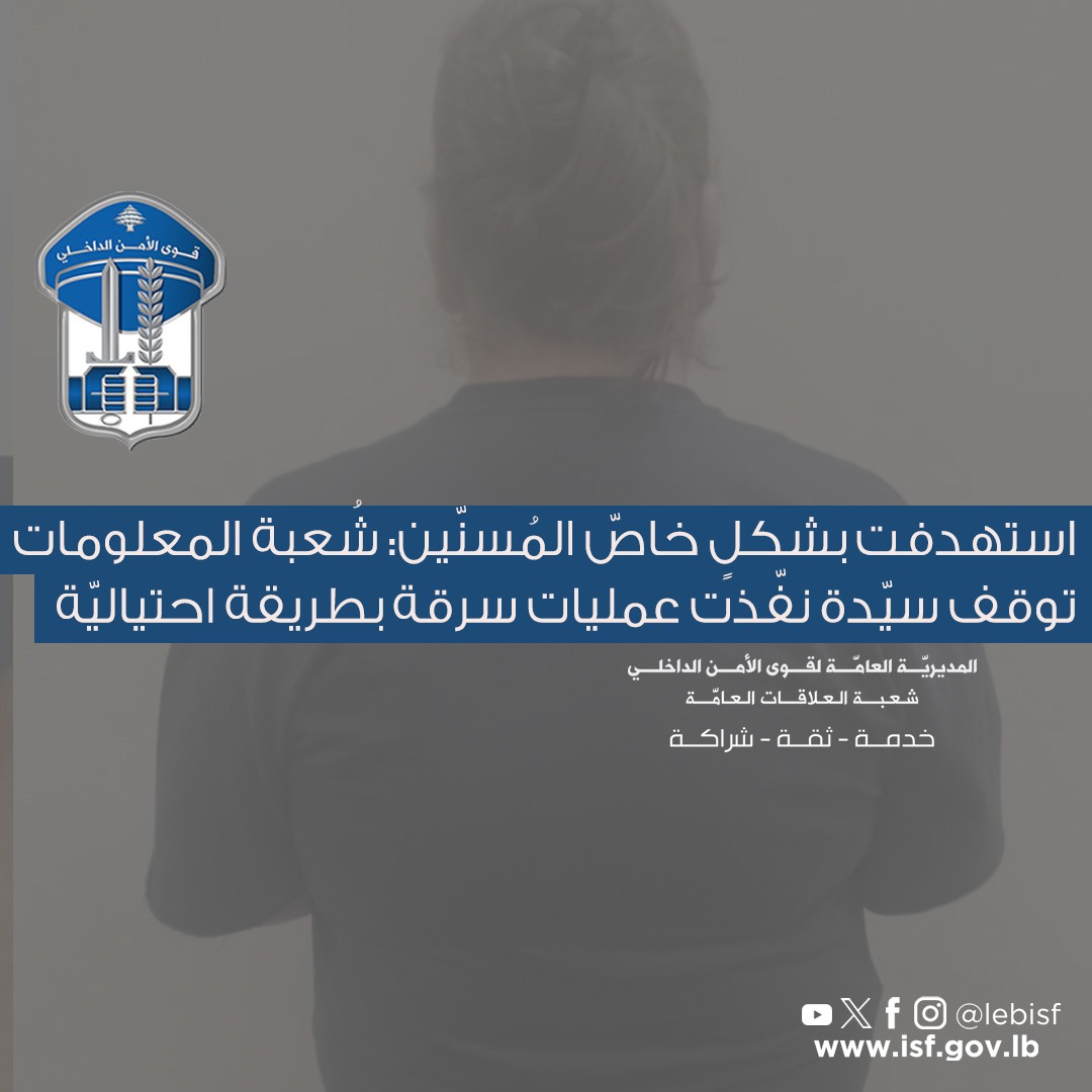 في إطار المتابعة اليومية التي تقوم بها قوى الأمن الداخلي لمكافحة عمليات السرقة في مختلف المناطق اللبنانية، توافرت معطيات لدى شعبة المعلومات حول قيام إحدى السيدات بتنفيذ عمليات سرقة بطريقة احتيالية استهدفت عددًا من المواطنين، لا سيّما من كبار السن، ضمن مدينة بيروت