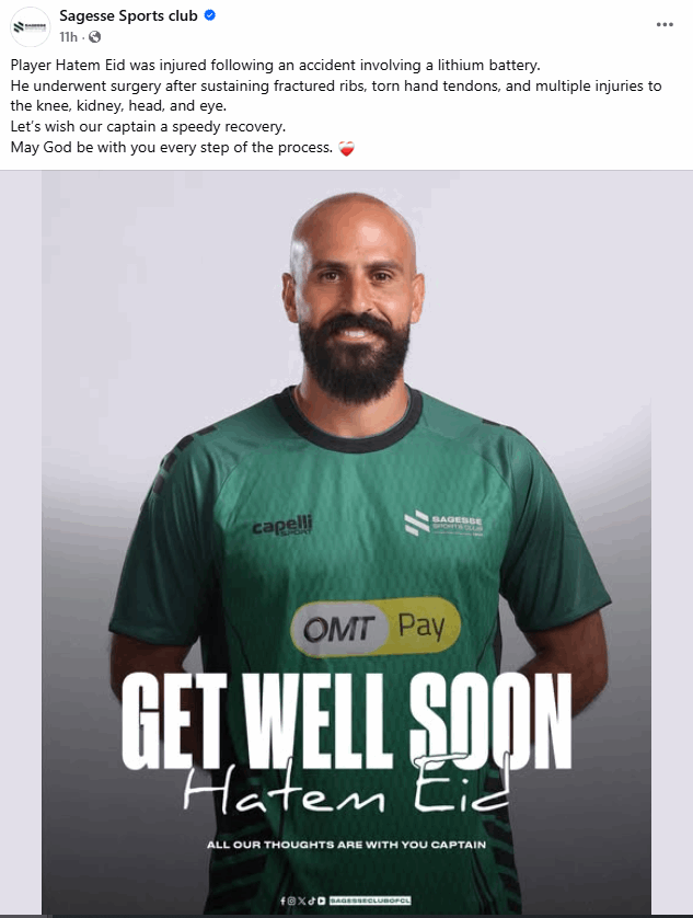 تعرّض قائد فريق الحكمة حاتم عيد لإصابات بليغة في جسده جرّاء انفجار بطارية ليثيوم إلى جانبه، وفق ما أعلن النادي.