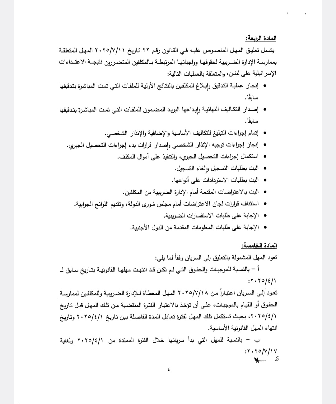 أصدر وزير المالية ياسين جابر قرارًا حدّد بموجبه آليات تطبيق الأحكام الواردة في المادة العاشرة من القانون رقم 22 تاريخ 11/7/2025، المتعلّق بمنح المتضرّرين من الاعتداءات الإسرائيلية على لبنان بعض الإعفاءات من الضرائب والرسوم، وتعليق المهل المرتبطة بالحقوق والواجبات الضريبية، إضافةً إلى معالجة أوضاع الوحدات العقارية أو أقسامها المهدّمة.