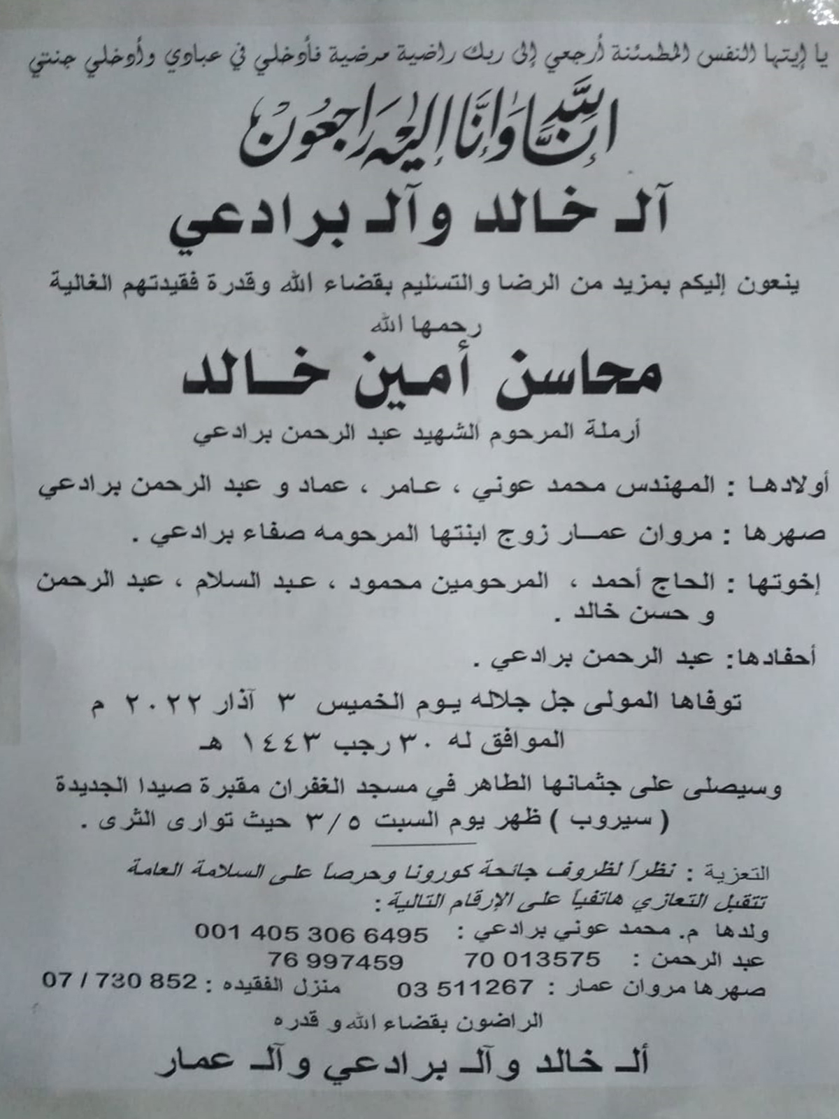 وفاة محاسن أمين خالد، الدفن ظهر يوم السبت 5 أذار 2022 السبت 05/آذار/2022 - 06:41 ص 3/5/2022 6:41:26 AM شارك