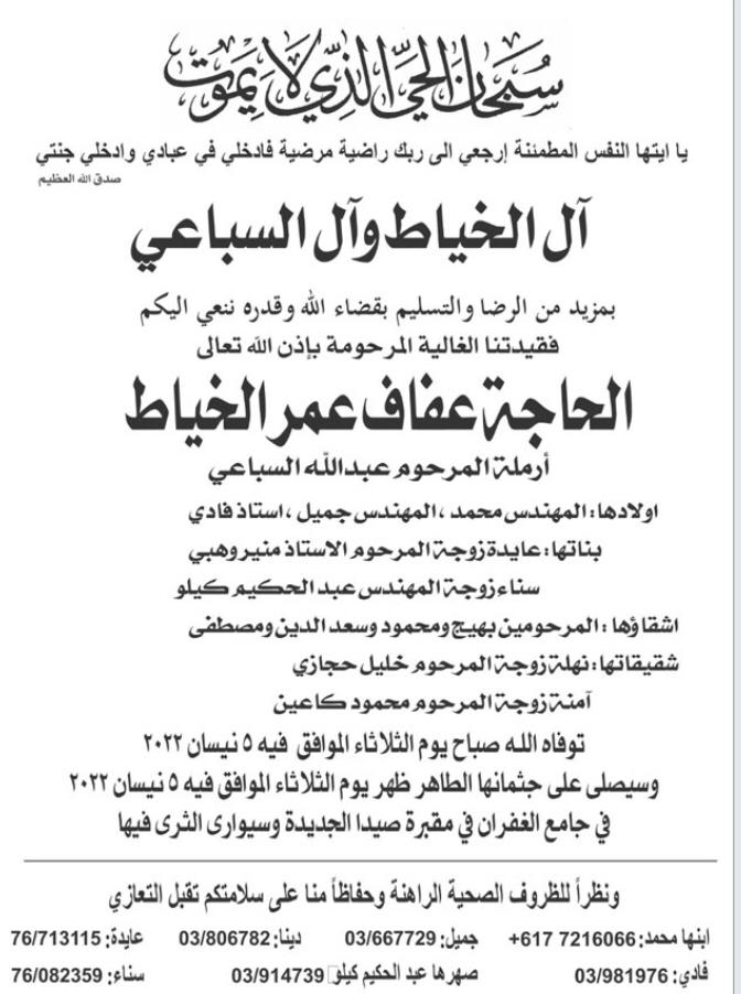 وفاة الحاجة عفاف عمر الخياط، الدفن ظهر يوم الثلاثاء 5 نيسان 2022 الثلاثاء 05/نيسان/2022 - 07:08 ص 4/5/2022 7:08:32 AM شارك