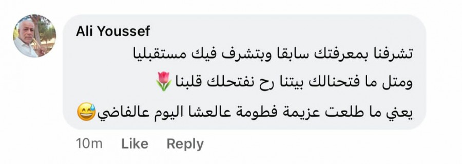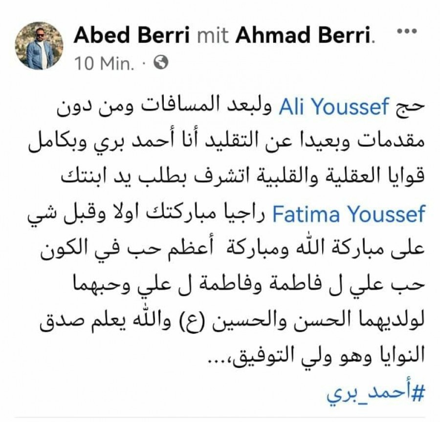 بالصور: الشاب أحمد بري 'يطلب يد' الشابة فاطمة 'أونلاين' من أبيها... فجاءه رده 'أونلاين' أيضاً ... ماذا قال له؟! السبت 04/شباط/2023 - 11:46 ص 2/4/2023 11:46:53 AM يا صور "بخطوة غير "تقليدية"، قرر الشاب احمد بري ان يطلب مباركة والد الشابة فاطمة يوسف على ارتباطهما وزواجهما عبر "بوست" نشره على صفحته على فيسبوك، وجاءه رد "حماه" بالمباركة في تعليق على منشوره . شارك