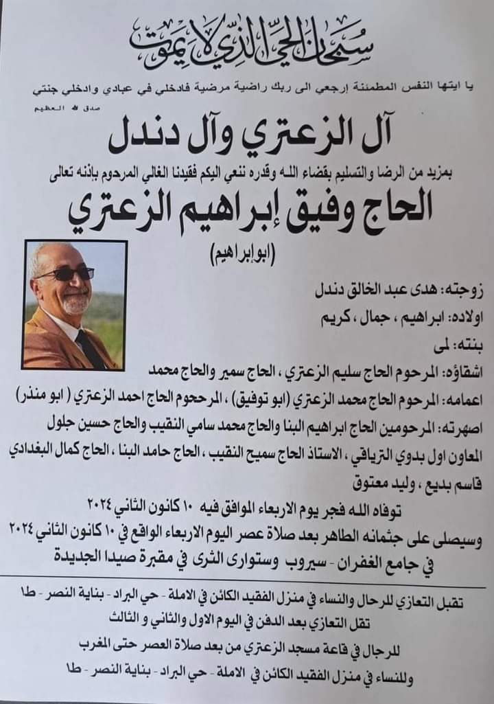 وفاة الحاج وفيق إبراهيم الزعتري، الدفن عصر يوم الأربعاء في 10 كانون الثاني 2024 الأربعاء 10/كانون الثاني/2024 - 09:44 ص 1/10/2024 9:44:48 AM شارك