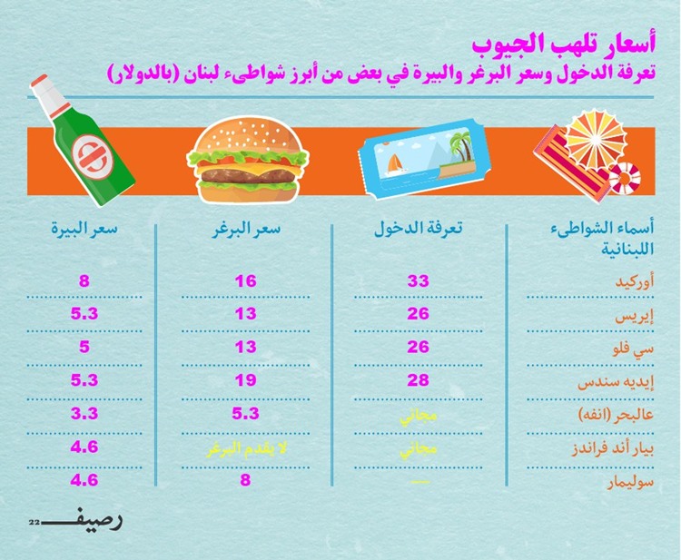 ووفق عدد نجوم المجمع والخدمات التي يقدمها، يراوح رسم الدخول للشخص الواحد بين 13$ و33$. نتحدث هنا عن تعرفة الدخول فقط، فمعظم المسابح تمنع الزبون من إدخال الطعام والمشروبات معه، حتى إن كان يحمل قنينة مياه شبه ممتلئة، وبضع حبات من الجنارك. وفي حال “تذاكى” المرء وعثر، من باب الصدفة طبعاً، على مسبح “رخيص”، فإنه سرعان ما يكتشف أنه حالما يقرر تناول شيء من المطاعم التي استثمرت جزءاً من الشاطىء، سيصرف ما حاول توفيره في المسبح الخاص. إذ أن سعر زجاجة المياه في المسابح ممكن أن يتخطّى الـ7$.
