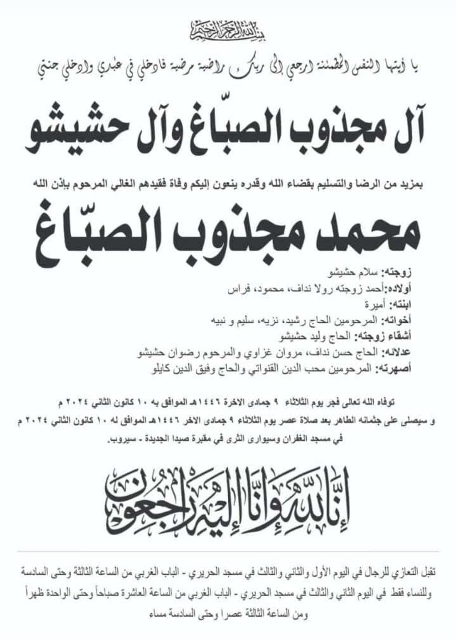 وفاة محمد مجذوب الصباغ، الدفن عصر يوم الثلاثاء في 10 كانون الاول 2024 الثلاثاء 10/كانون الأول/2024 - 11:42 ص 12/10/2024 11:42:32 AM شارك