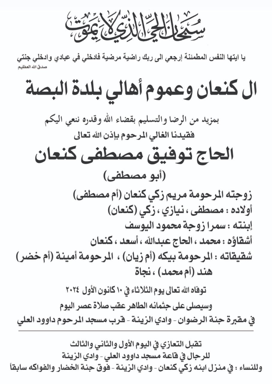 وفاة الحاج توفيق مصطفى كنعان (ابو مصطفى)، الدفن عصر يوم الثلاثاء في 10 كانون الاول 2024 الثلاثاء 10/كانون الأول/2024 - 11:45 ص 12/10/2024 11:45:00 AM شارك