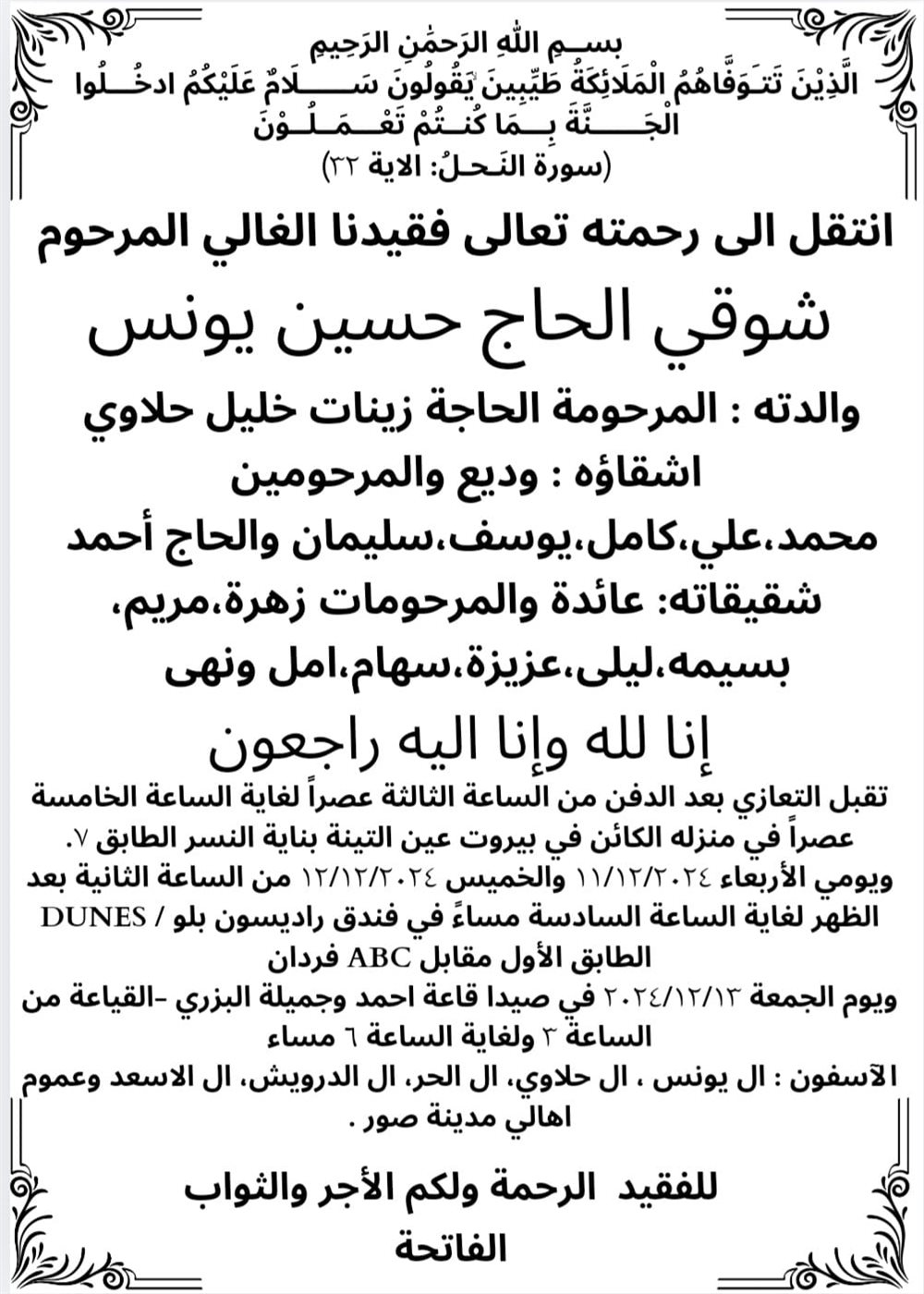 وفاة شوقي الحاج حسين يونس، العزاء في صيدا يوم الجمعة في 13 كانون الاول 2024 الثلاثاء 10/كانون الأول/2024 - 12:14 م 12/10/2024 12:14:27 PM شارك