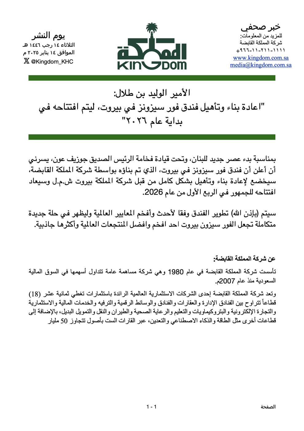 وكتب بن طلال عبر منصة"اكس": "بمناسبة بدء عصر جديد للبنان، وتحت قيادة الرئيس الصديق جوزاف عون، يسرني ان اعلن ان فندق فور سيزونز في بيروت، الذي تم بناؤه بواسطة شركة المملكة القابضة، سيخضع لاعادة بناء وتأهيل بشكل كامل من قبل شركة المملكة بيروت ش.م.ل وسيعاد افتتاحه للجمهور في الربع الاول من عام 2026".