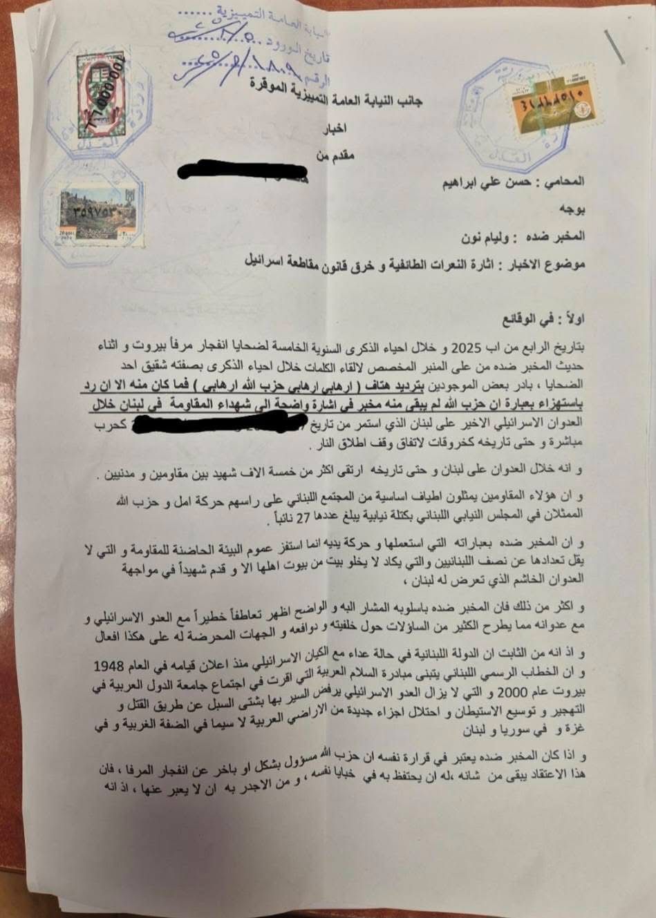 أفادت "الجديد" أن المباحث الجنائية المركزية إستدعت الناشط وليم نون شقيق الضحية في إنفجار مرفأ بيروت جو نون، الى التحقيق بعد الإخبار المقدم ضده بجرم إثارة النعرات الطائفية وخرق قانون التعامل مع إسرائيل.