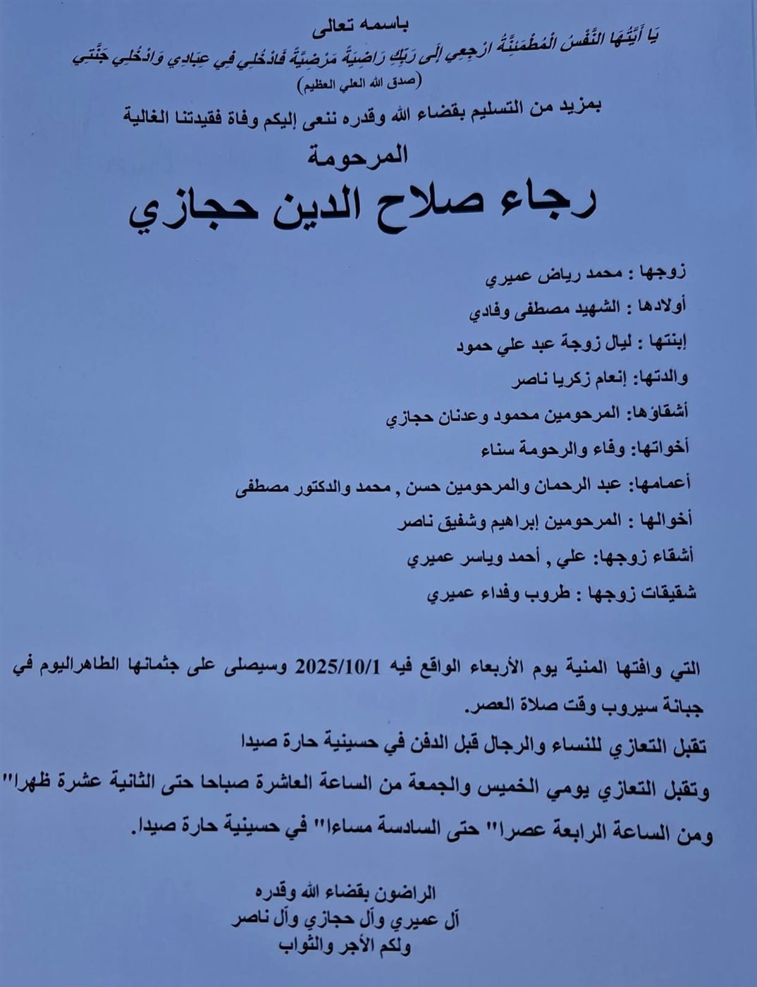 وفاة رجاء صلاح الدين حجازي، الدفن عصر يوم الاربعاء 1 تشرين الاول 2025 الأربعاء 01/تشرين الأول/2025 - 11:01 ص 10/1/2025 11:01:44 AM شارك
