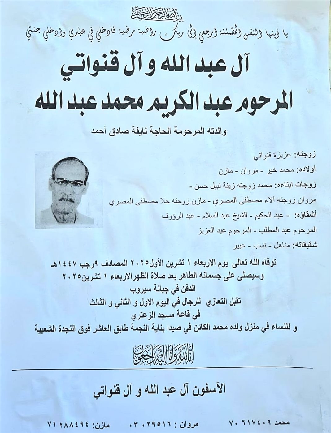 وفاة عبدالكريم محمد عبد الله، الدفن ظهر يوم الاربعاء في 1 تشرين الاول 2025 الأربعاء 01/تشرين الأول/2025 - 12:45 م 10/1/2025 12:45:11 PM شارك