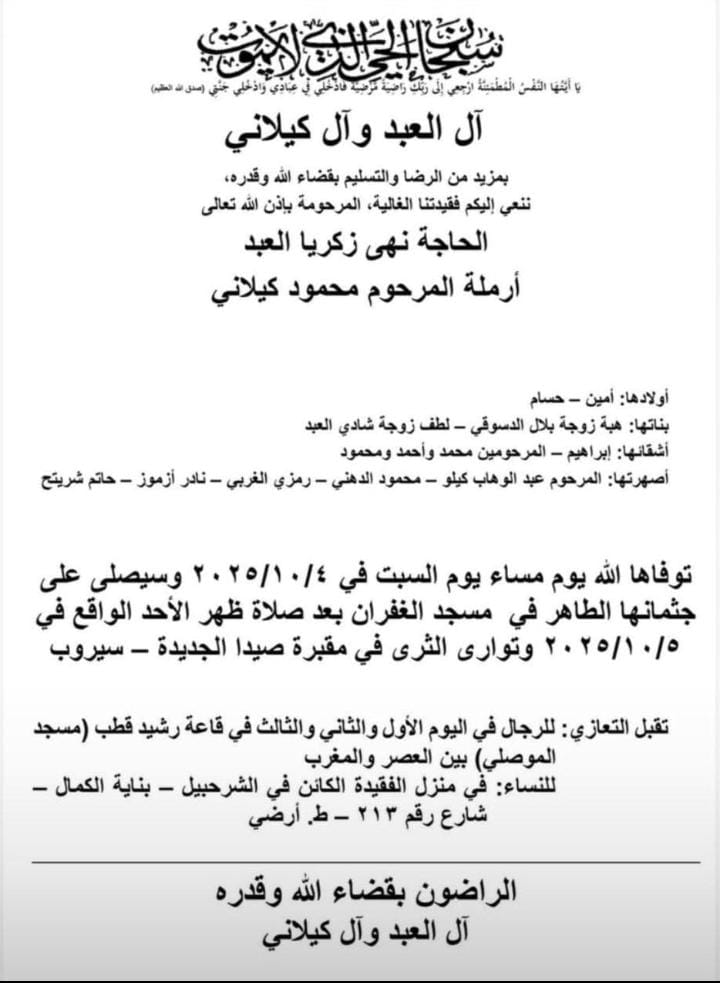 وفاة الحاجة نهى زكريا العبد، الدفن ظهر يوم الاحد في 5 تشرين الاول 2025 الأحد 05/تشرين الأول/2025 - 11:21 ص 10/5/2025 11:21:19 AM شارك
