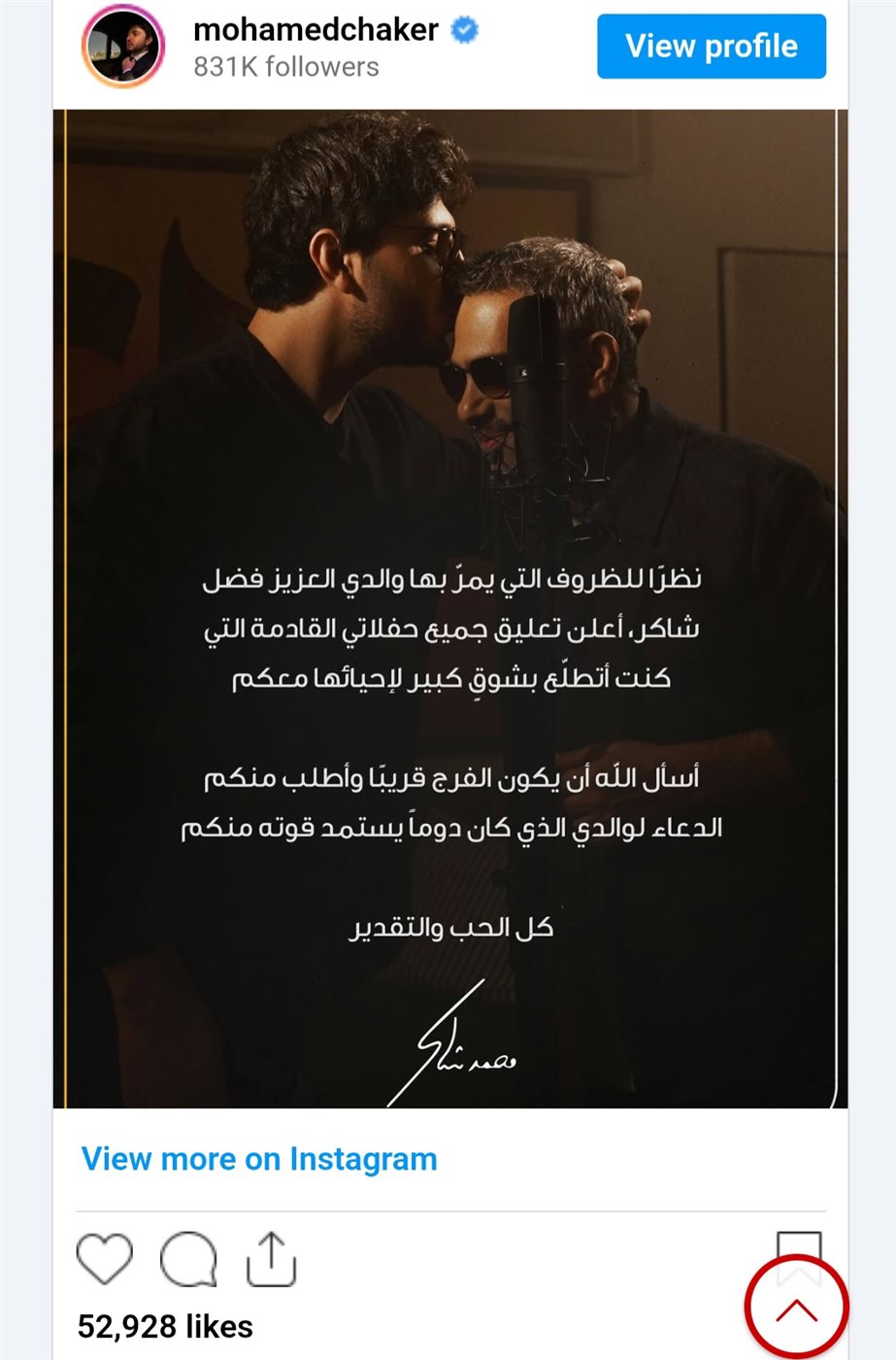 نشر الفنان محمد شاكر عبر حسابه الرسمي على تطبيق "إنستغرام" صورة جمعته بوالده الفنان فضل شاكر، أرفقها ببيانٍ أعلن فيه تعليق جميع حفلاته المقبلة.