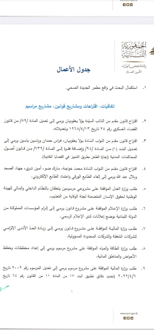 جلسة لمجلس الوزراء... إليكم جدول أعمالها الثلاثاء 07/تشرين الأول/2025 - 05:43 م 10/7/2025 5:43:17 PM لبنان 24 يعقد مجلس الوزراء جلسة عند الساعة الثالثة من بعد ظهر يوم الخميس 9-10-2025، في السراي الكبير. شارك