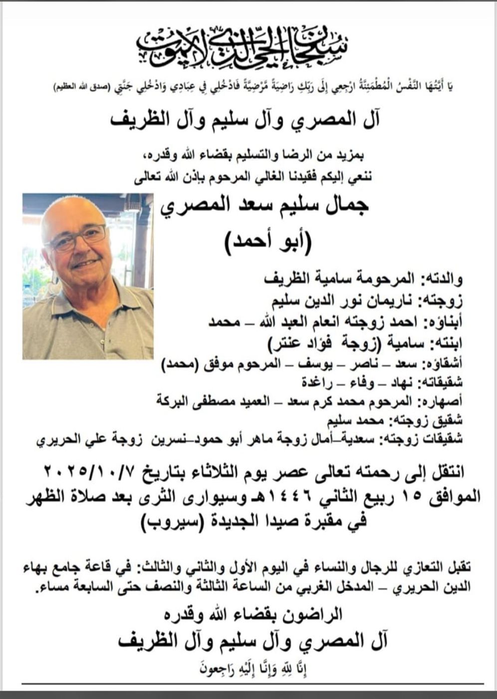 وفاة جمال سليم سعد المصري (ابو احمد)، الدفن ظهر يوم الاربعاء في 8 تشرين الاول 2025 الثلاثاء 07/تشرين الأول/2025 - 07:43 م 10/7/2025 7:43:16 PM شارك