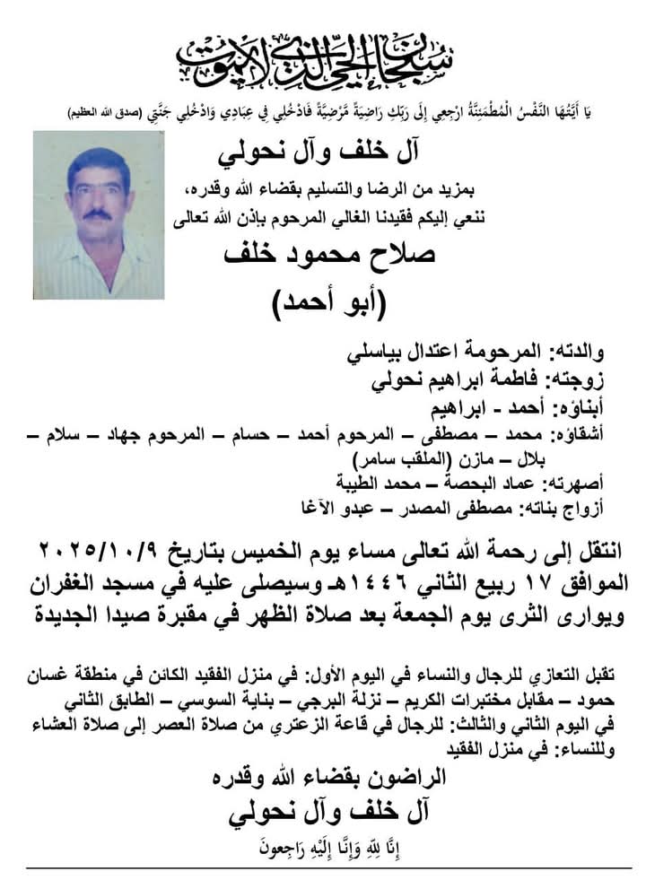 وفاة صلاح محمود خلف (ابو احمد)، الدفن ظهر يوم الجمعة في 9 تشرين الاول 2025 الجمعة 10/تشرين الأول/2025 - 08:48 ص 10/10/2025 8:48:13 AM شارك