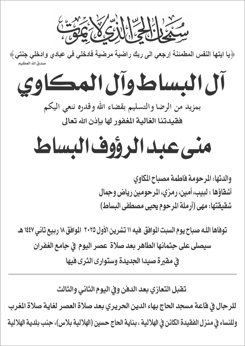 وفاة منى عبدالرؤوف البساط، الدفن عصر يوم السبت في 11 تشرين الاول 2025 السبت 11/تشرين الأول/2025 - 09:47 ص 10/11/2025 9:47:33 AM شارك