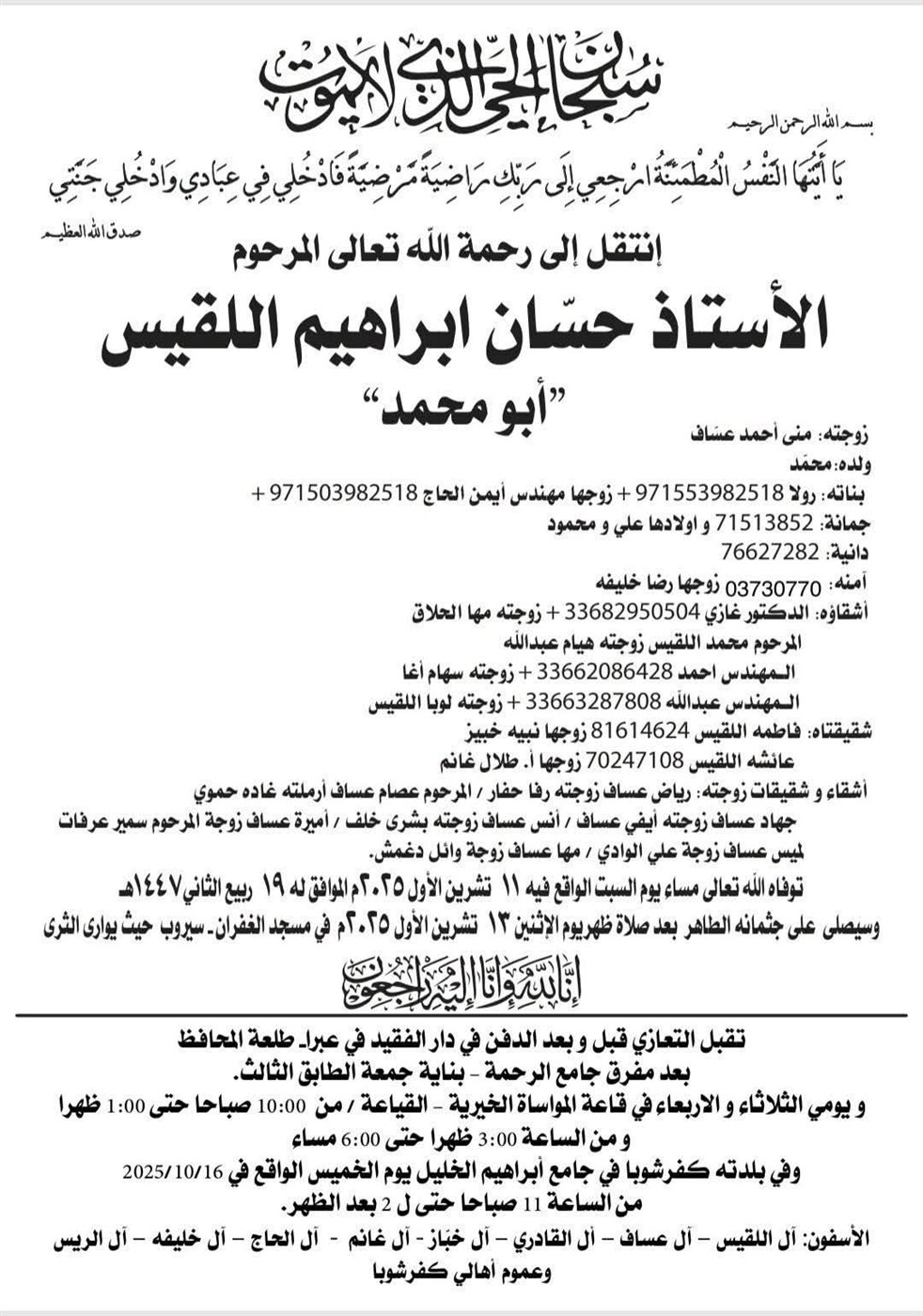 وفاة الاستاذ حسان ابراهيم اللقيس "ابو محمد"، الدفن ظهر يوم الاثنين في 13 تشرين الاول 2025 الإثنين 13/تشرين الأول/2025 - 12:03 ص 10/13/2025 12:03:57 AM شارك
