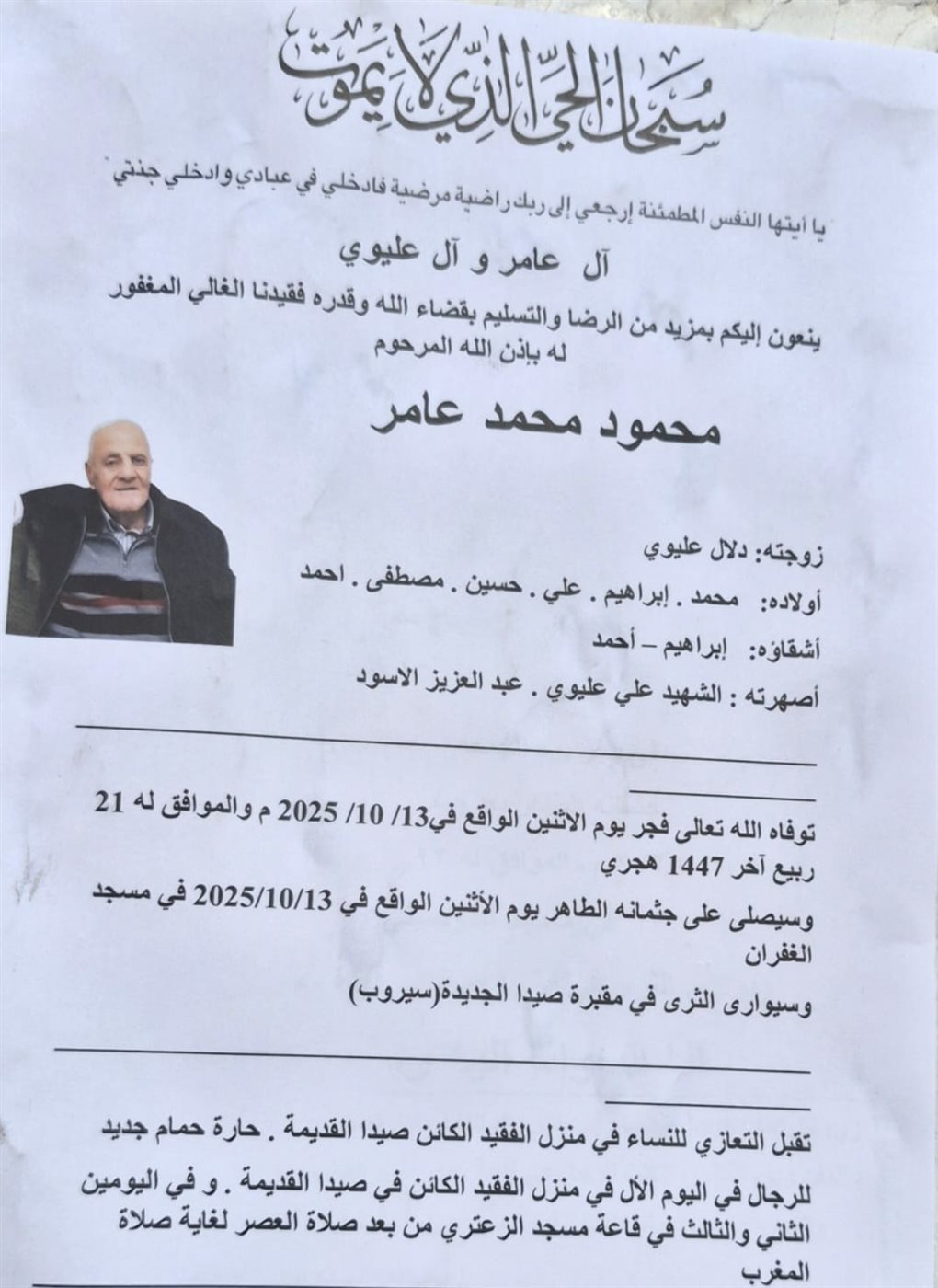 وفاة محمود محمد عامر، الدفن الاثنين في 13 تشرين الاول 2025 الإثنين 13/تشرين الأول/2025 - 09:46 ص 10/13/2025 9:46:00 AM شارك