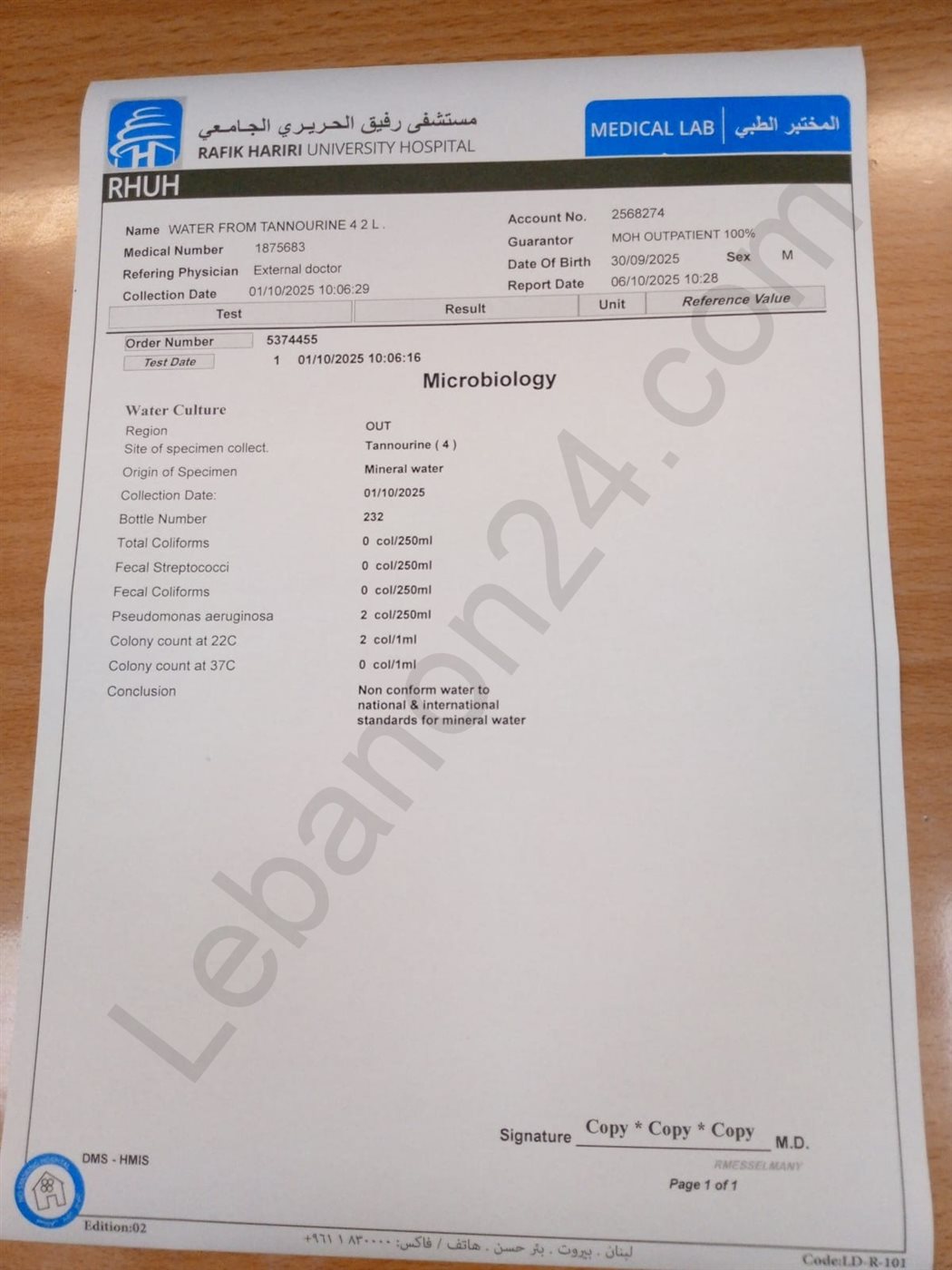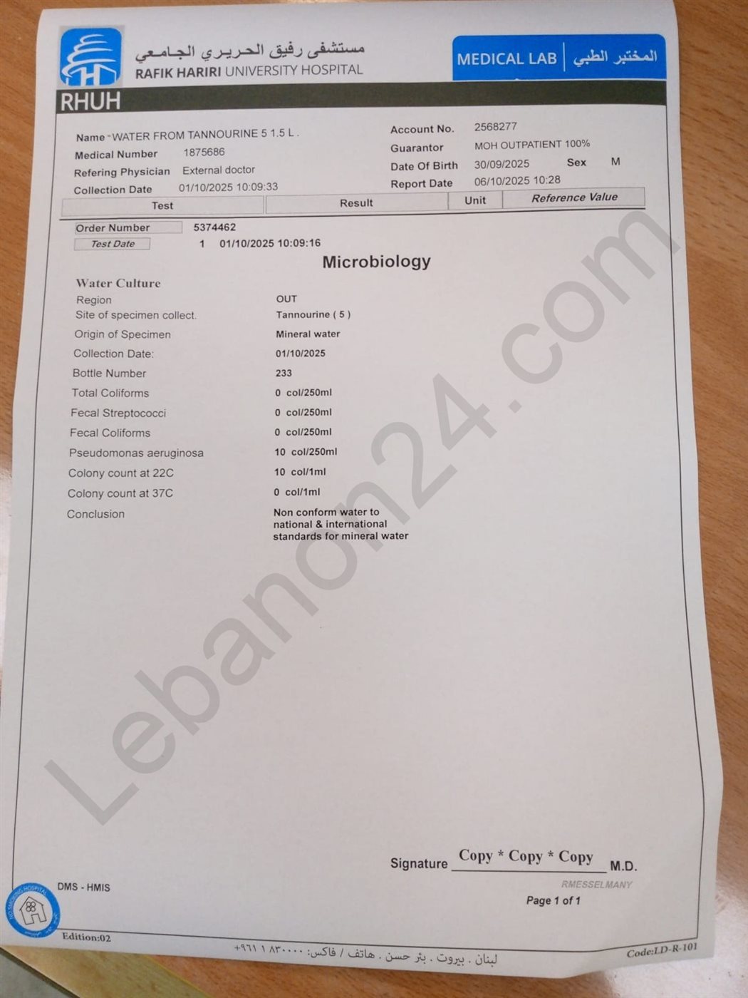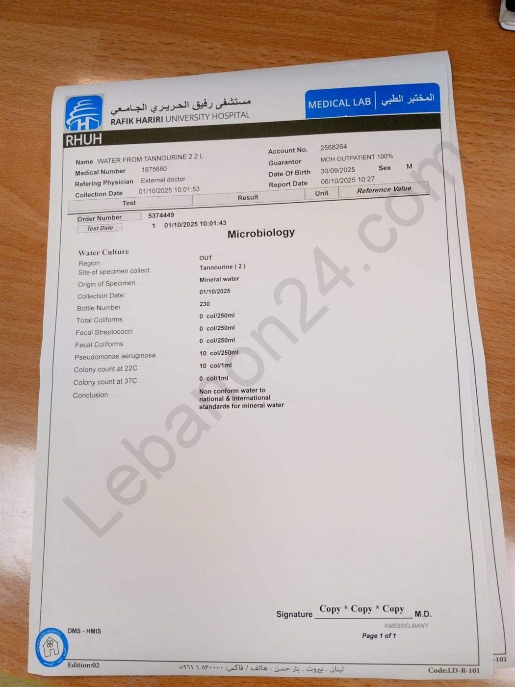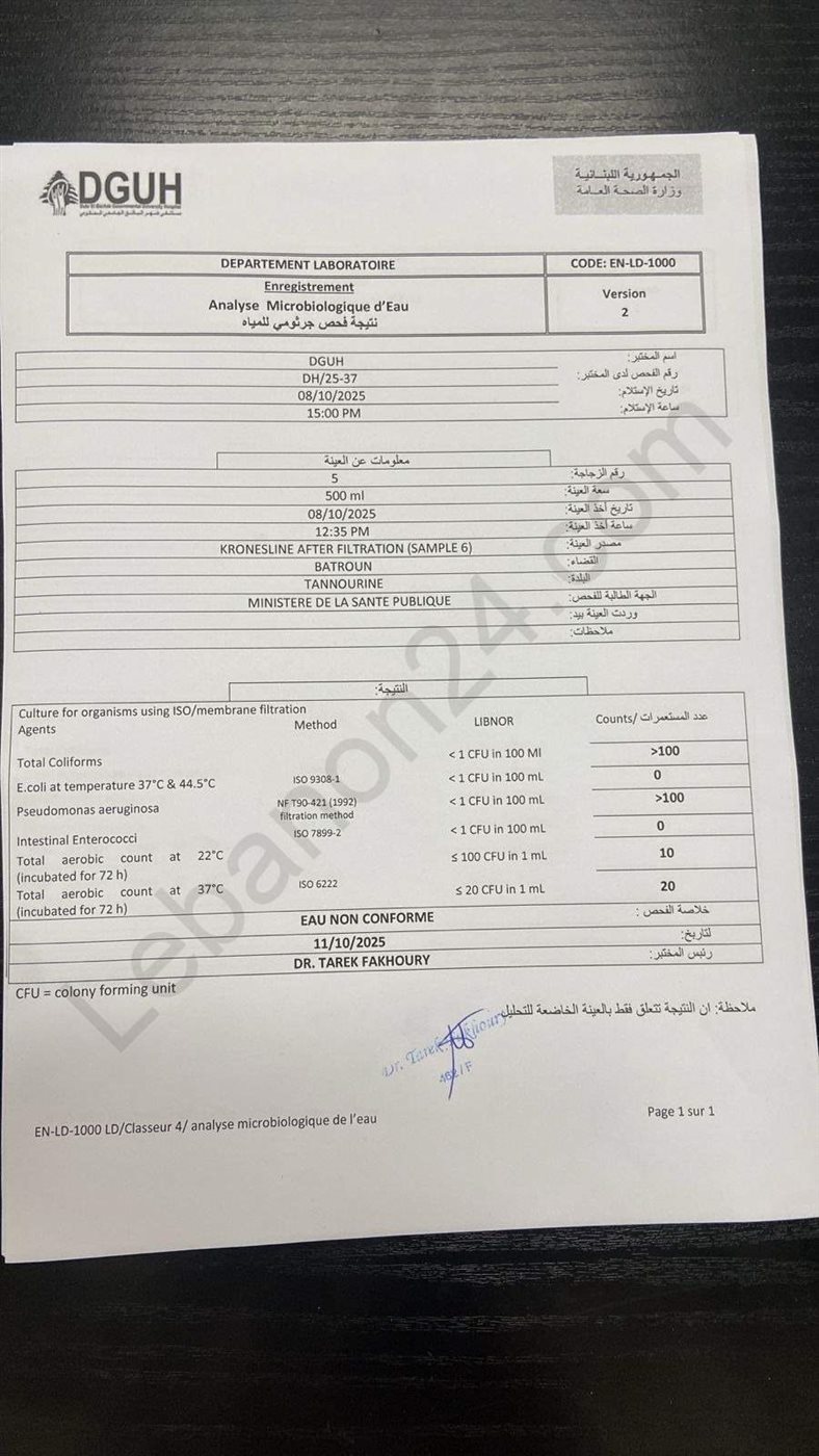 اطلع "لبنان24" على نتائج الفحوصات المخبرية التي أجرتها وزارة الصحة العامة لعينات مأخوذة من مياه "تنورين"، والتي أظهرت وجود تلوث فيها.
