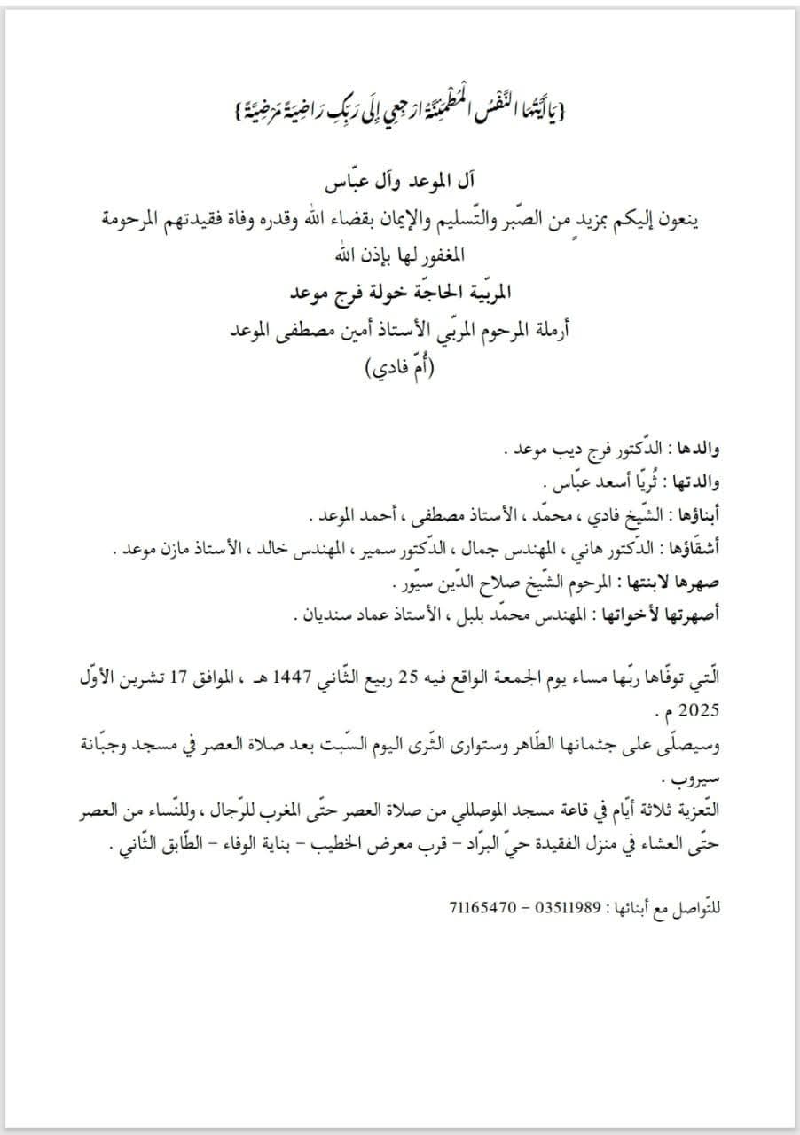 وفاة المربية الحاجة خولة فرج موعد، الدفن عصر يوم السبت في 18 تشرين الاول 2025 السبت 18/تشرين الأول/2025 - 11:32 ص 10/18/2025 11:32:27 AM شارك