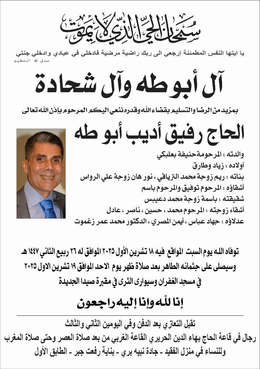 وفاة الحاج رفيق أديب ابو طه، الدفن ظهر يوم الاحد في 19 تشرين الاول 2025 السبت 18/تشرين الأول/2025 - 07:09 م 10/18/2025 7:09:13 PM شارك