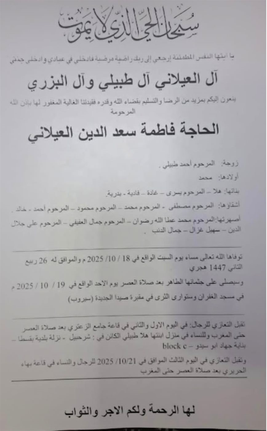 وفاة الحاجة فاطمة سعد الدين العيلاني، الدفن عصر يوم الاحد في 19 تشرين الاول 2025 الأحد 19/تشرين الأول/2025 - 12:04 م 10/19/2025 12:04:12 PM شارك