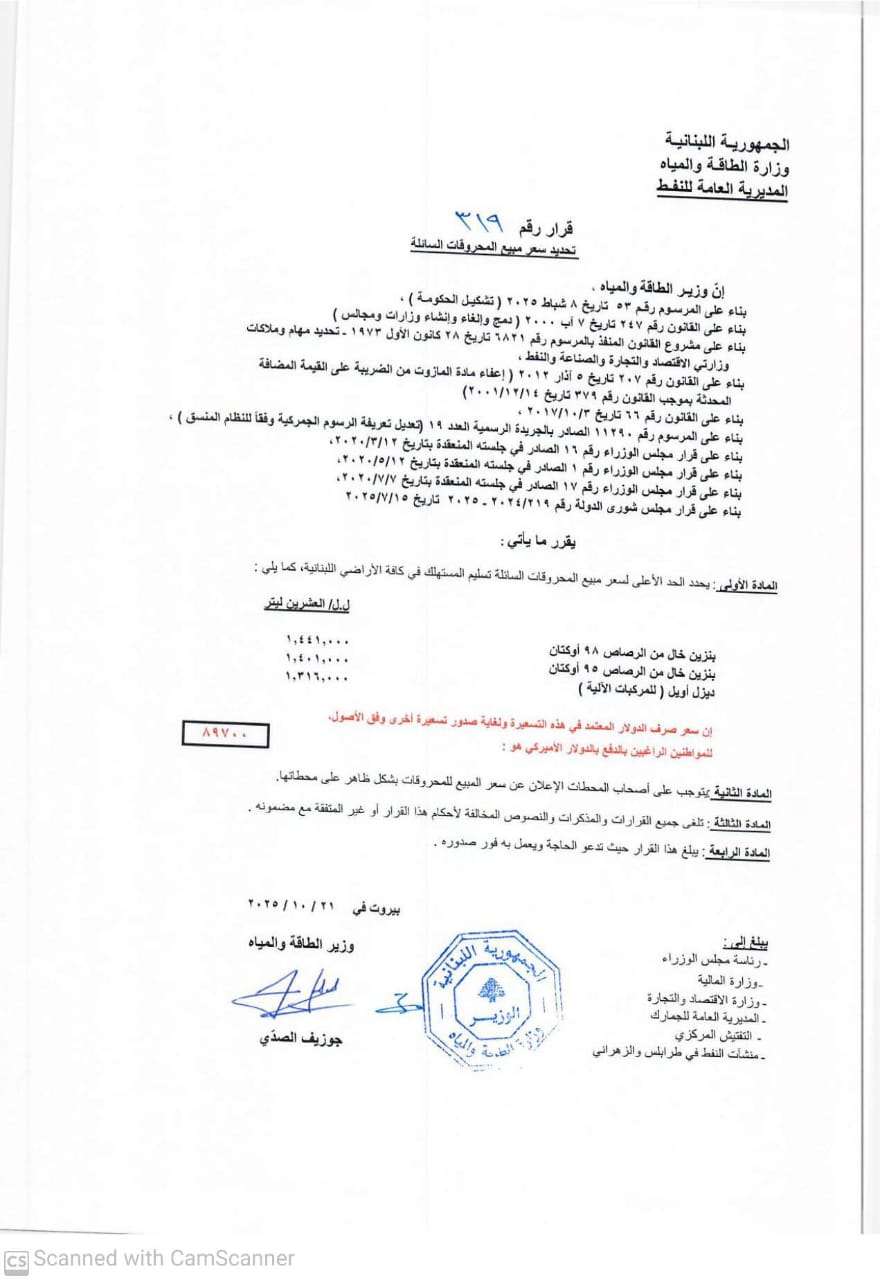 إنخفض اليوم، سعر صفيحتي البنزين 95 و98 أوكتان 14 آلف ليرة والمازوت 12 ألف ليرة وقارورة الغاز 22 ألف ليرة، وأصبحت الأسعار على الشكل التالي: