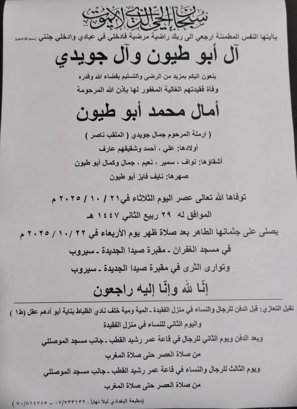 وفاة آمال محمد أبو طيون، الدفن ظهر يوم الاربعاء في 22 تشرين الاول 2025 الثلاثاء 21/تشرين الأول/2025 - 09:50 م 10/21/2025 9:50:22 PM شارك
