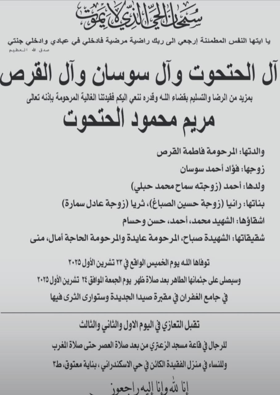 وفاة مريم محمود الحتحوت، الدفن ظهر يوم الجمعة في 24 تشرين الاول 2025 الخميس 23/تشرين الأول/2025 - 04:08 م 10/23/2025 4:08:53 PM شارك