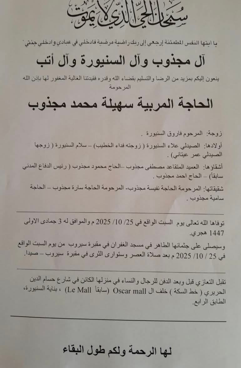 وفاة الحاجة المربية سهيلة محمد مجذوب، الدفن عصر يوم السبت في 25 تشرين الاول 2025 السبت 25/تشرين الأول/2025 - 11:54 ص 10/25/2025 11:54:07 AM شارك
