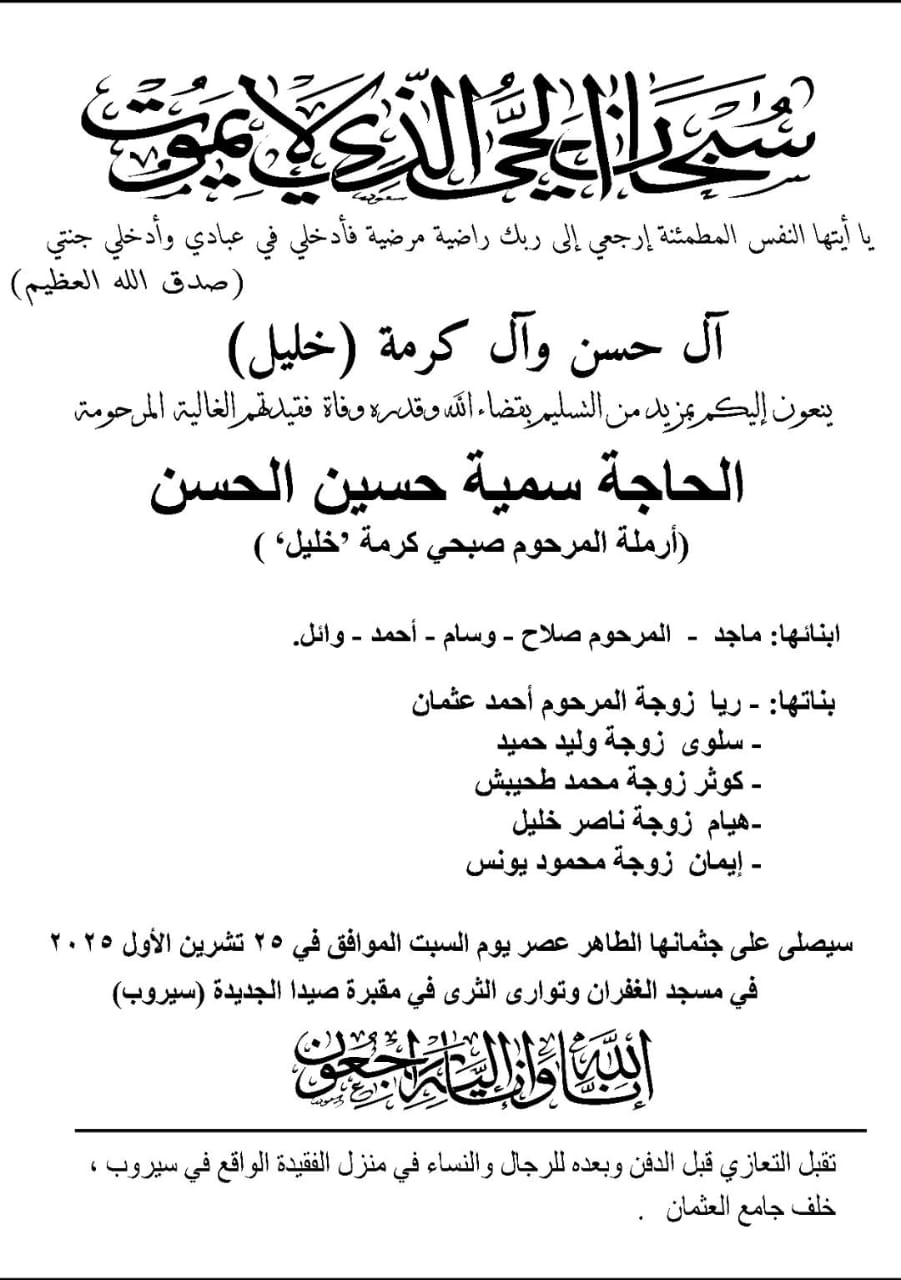 وفاة الحاجة سمية حسين الحسن، الدفن عصر يوم السبت في 25 تشرين الاول 2025 السبت 25/تشرين الأول/2025 - 05:40 م 10/25/2025 5:40:33 PM شارك
