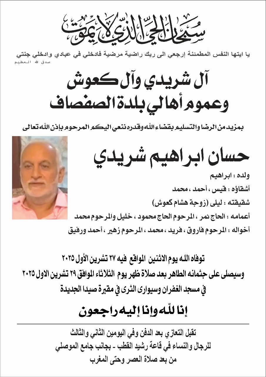 وفاة حسان ابراهيم شريدي، الدفن ظهر يوم الثلاثاء في 29 تشرين الاول 2025 الإثنين 27/تشرين الأول/2025 - 02:45 م 10/27/2025 2:45:06 PM شارك