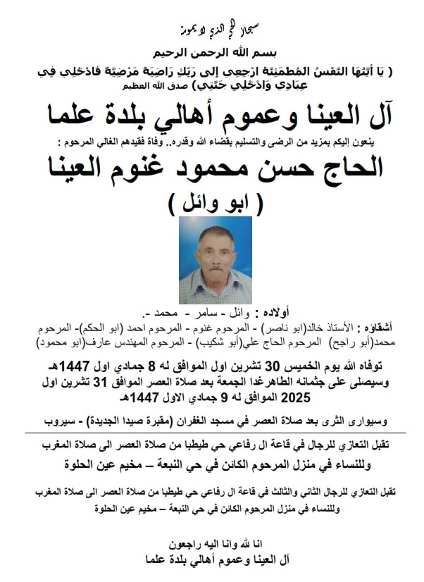 وفاة الحاج حسن محمود غنوم العينا (ابو وائل)، الدفن عصر يوم الجمعة في 31 تشرين الاول 2025 الجمعة 31/تشرين الأول/2025 - 07:14 ص 10/31/2025 7:14:24 AM شارك