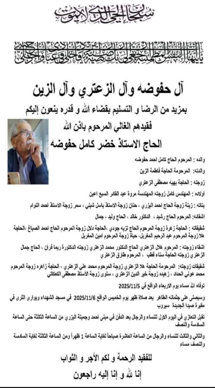 وفاة الحاج الاستاذ خضر كامل حفوضة، الدفن ظهر يوم الخميس في 6 تشرين الثاني 2025 الخميس 06/تشرين الثاني/2025 - 12:45 ص 11/6/2025 12:45:10 AM شارك