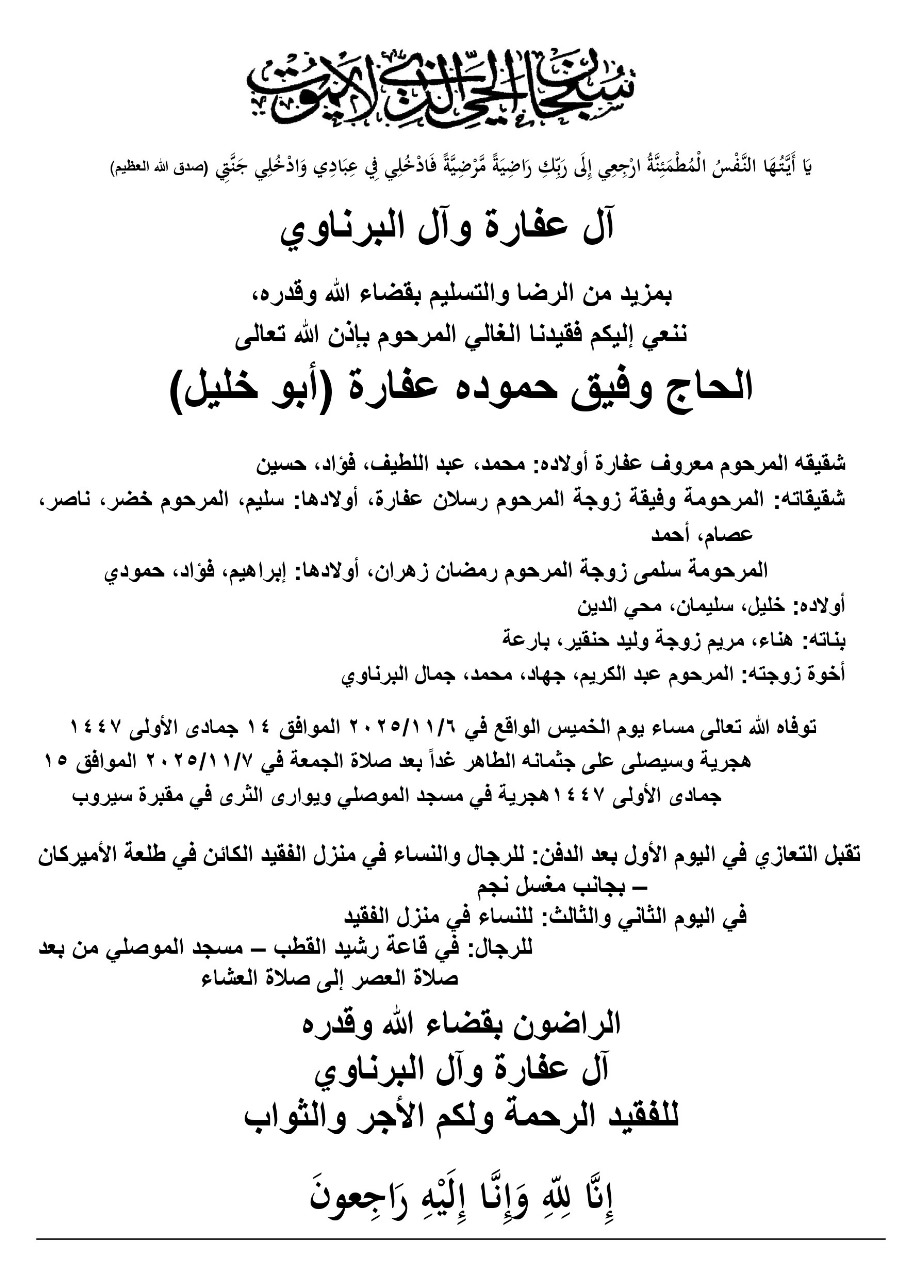 وفاة الحاج وفيق حموده عفارة (ابو خليل)، الدفن ظهر يوم الجمعة في 7 تشرين الثاني 2025 الخميس 06/تشرين الثاني/2025 - 10:52 م 11/6/2025 10:52:20 PM شارك
