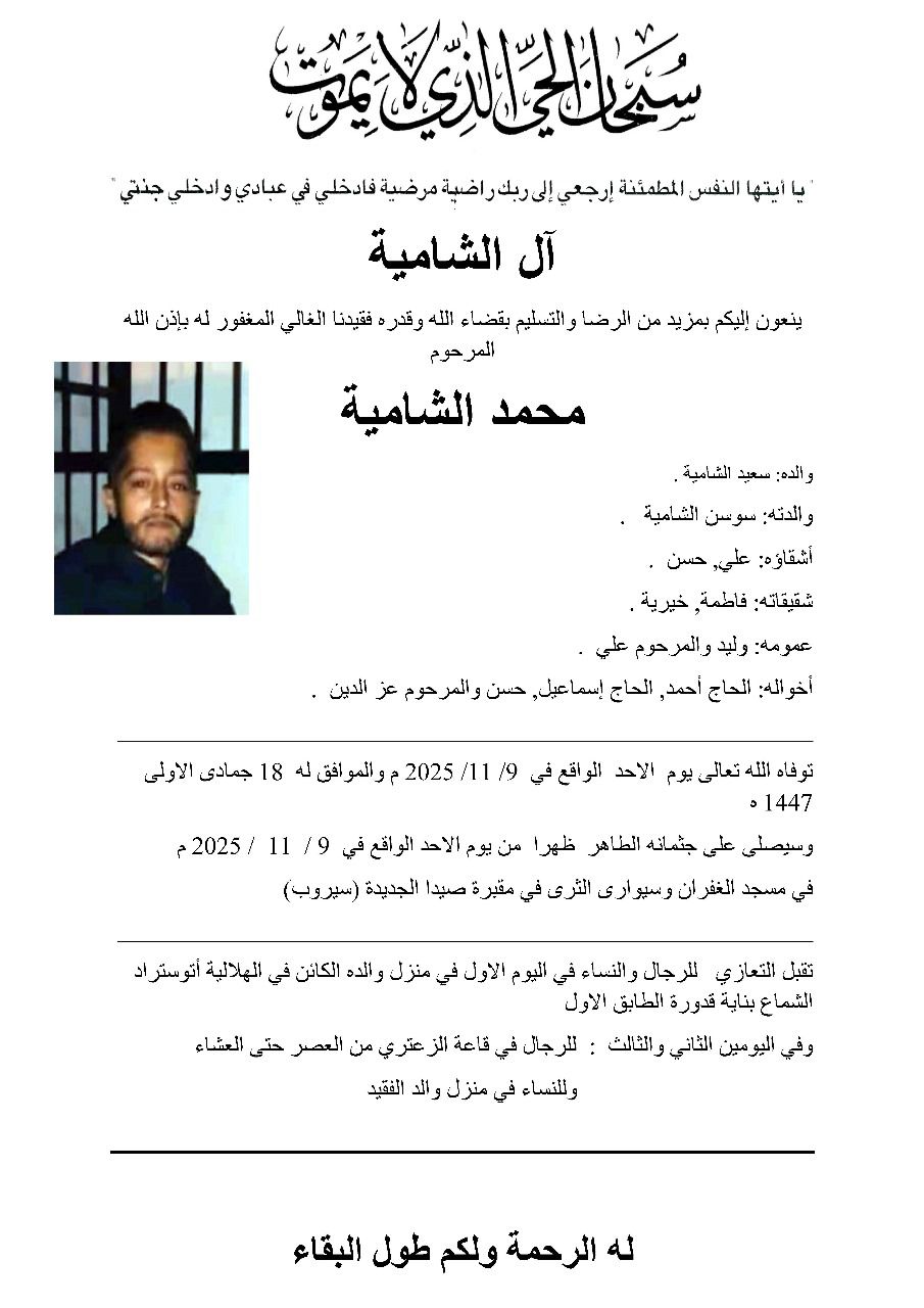 وفاة محمد سعيد الشامية، الدفن ظهر يوم الاحد في 9 تشرين الثاني 2025 الأحد 09/تشرين الثاني/2025 - 10:20 ص 11/9/2025 10:20:06 AM شارك