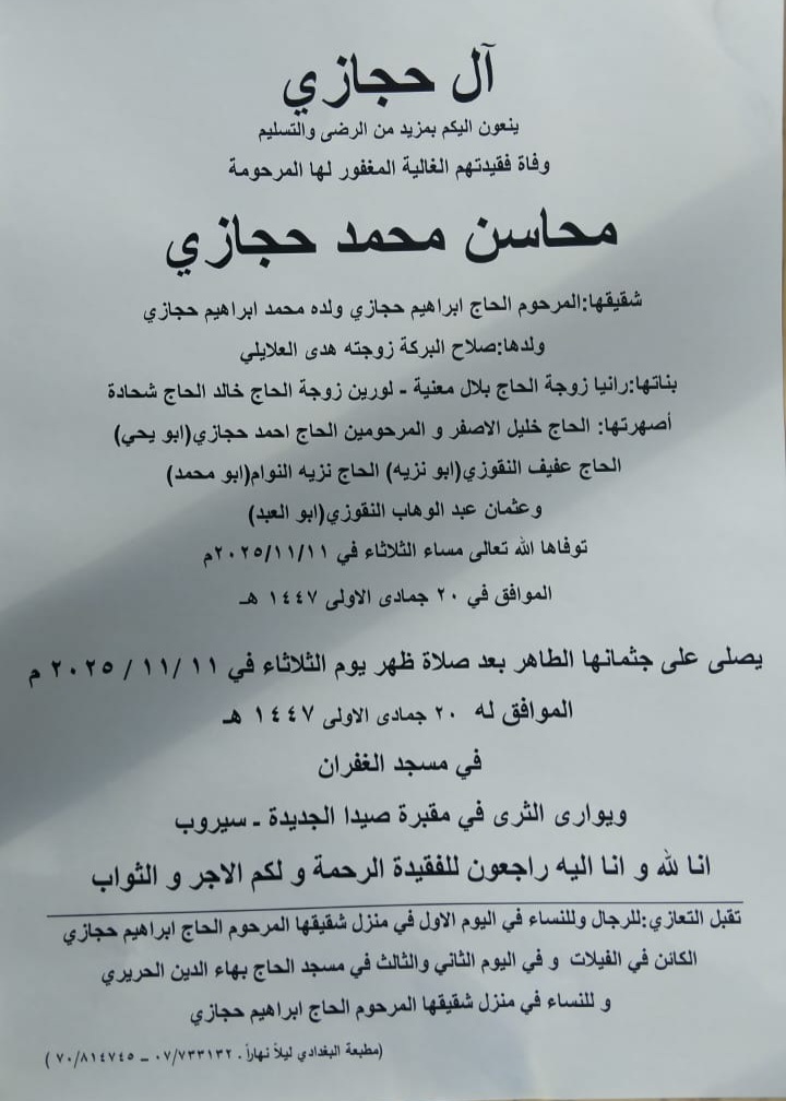 وفاة محاسن محمد حجازي، الدفن ظهر يوم الثلاثاء في 11 تشرين الثاني 2025 الثلاثاء 11/تشرين الثاني/2025 - 09:32 ص 11/11/2025 9:32:21 AM شارك