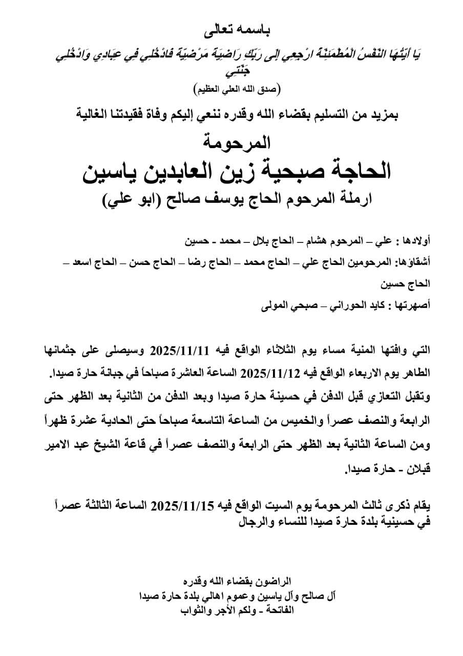 وفاة الحاجة صبحية زين العابدين ياسين، الدفن العاشرة صباحا من ظهر يوم الاربعاء في 12 تشرين الثاني 2025 الأربعاء 12/تشرين الثاني/2025 - 02:28 م 11/12/2025 2:28:46 PM شارك