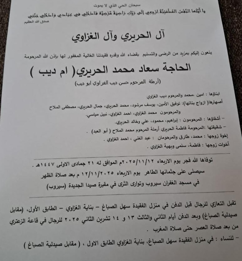 وفاة الحاجة سعاد محمد الحريري (ام ديب)، الدفن ظهر يوم الاربعاء في 12 تشرين الثاني 2025 الأربعاء 12/تشرين الثاني/2025 - 02:33 م 11/12/2025 2:33:27 PM شارك