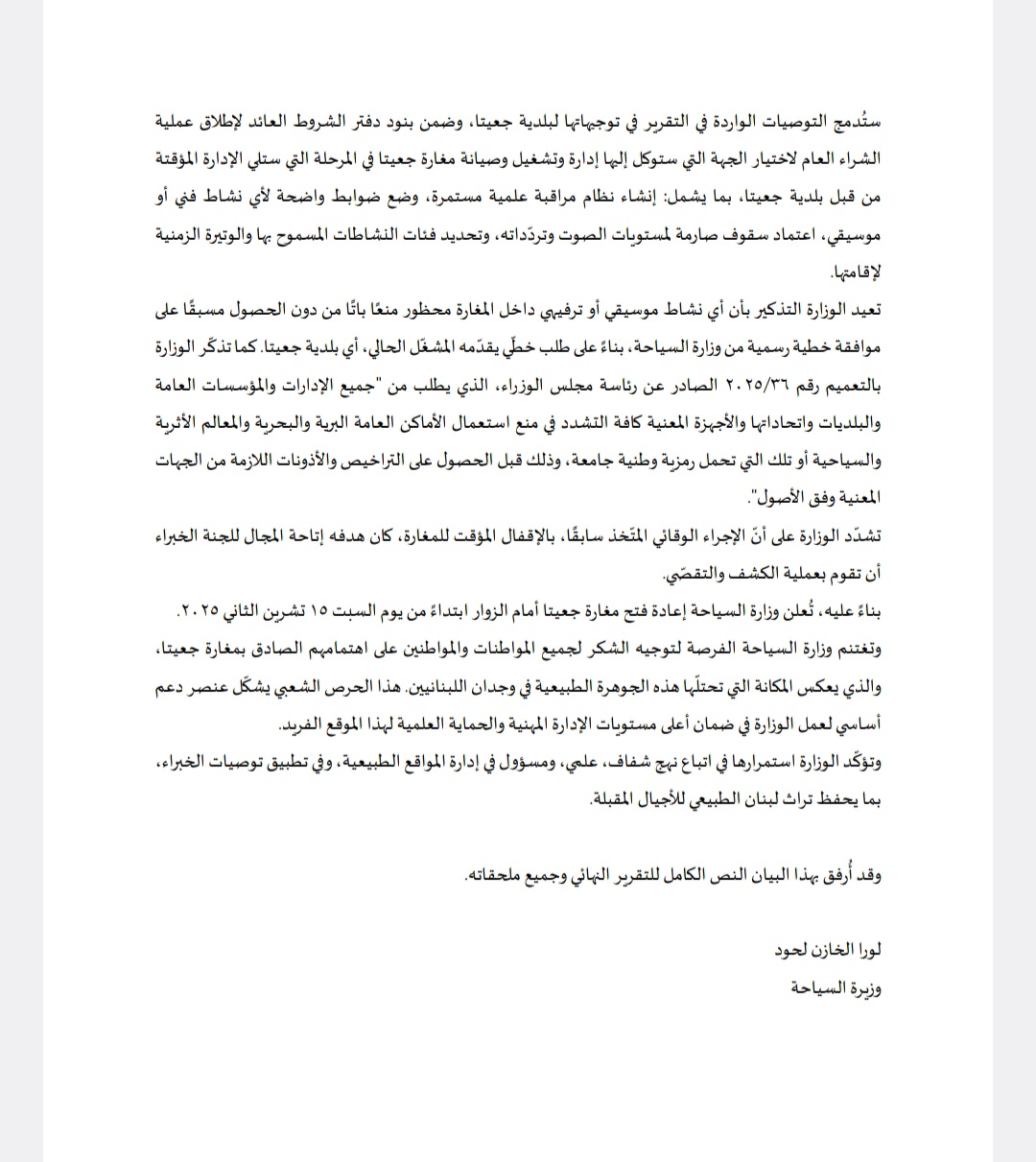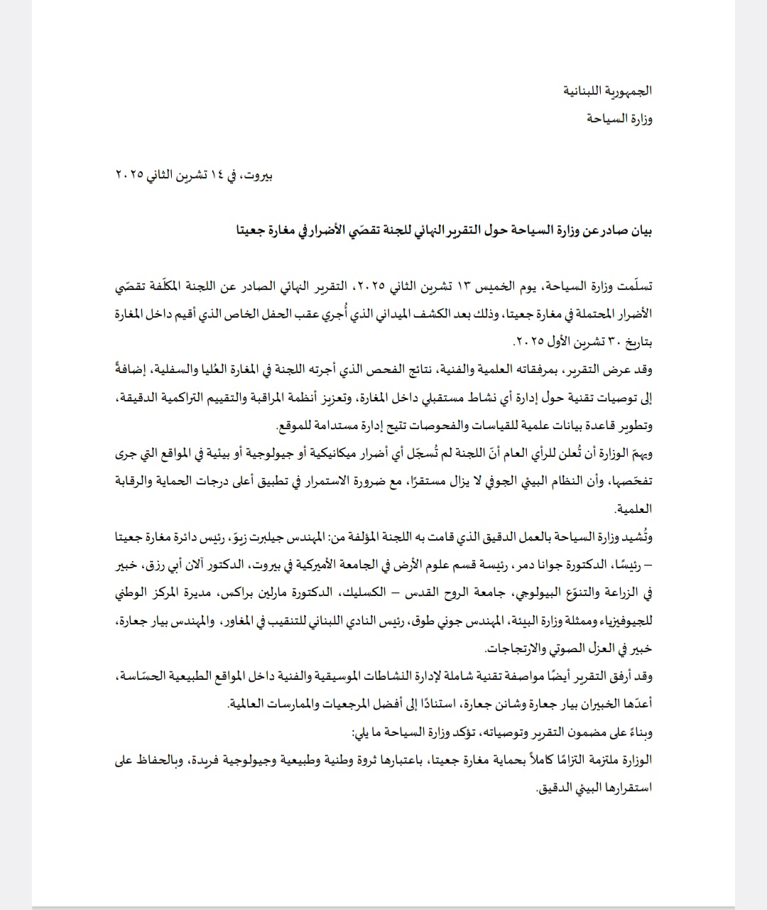 أصدرت وزارة السياحة بيانا حول التقرير النهائي للجنة تقصي الأضرار في مغارة جعيتا، بعد أن أقيم حفل زفاف في داخلها.