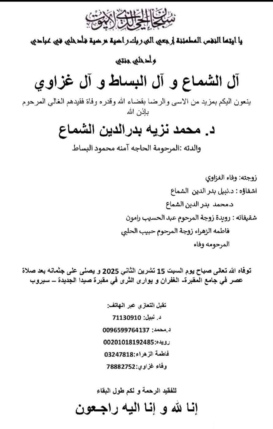 وفاة د. محمد نزيه بدر الدين الشماع، الدفن عصر يوم السبت في 15 تشرين الثاني 2025 السبت 15/تشرين الثاني/2025 - 10:59 ص 11/15/2025 10:59:02 AM شارك