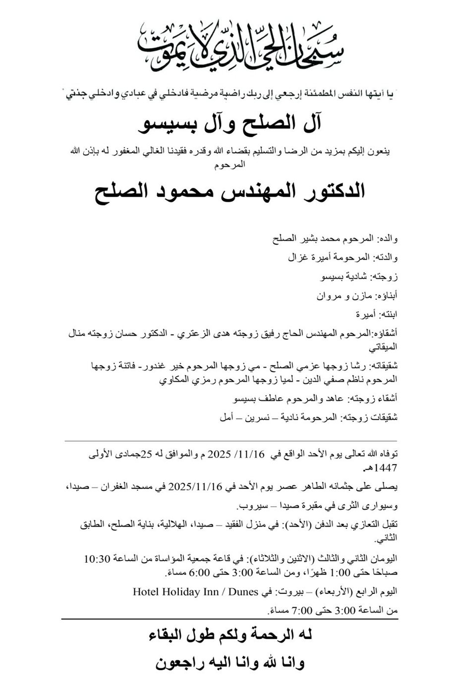 وفاة الدكتور المهندس محمود الصلح، الدفن عصر يوم الاحد في 16 تشرين الثاني 2025 الأحد 16/تشرين الثاني/2025 - 02:16 م 11/16/2025 2:16:13 PM شارك