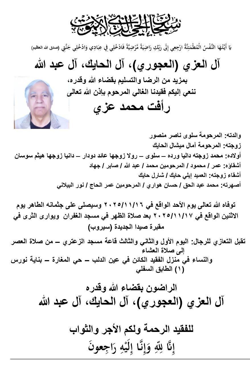 وفاة رأفت محمد عزي، الدفن ظهر يوم الاثنين في 17 تشرين الثاني 2025 الأحد 16/تشرين الثاني/2025 - 08:16 م 11/16/2025 8:16:07 PM شارك