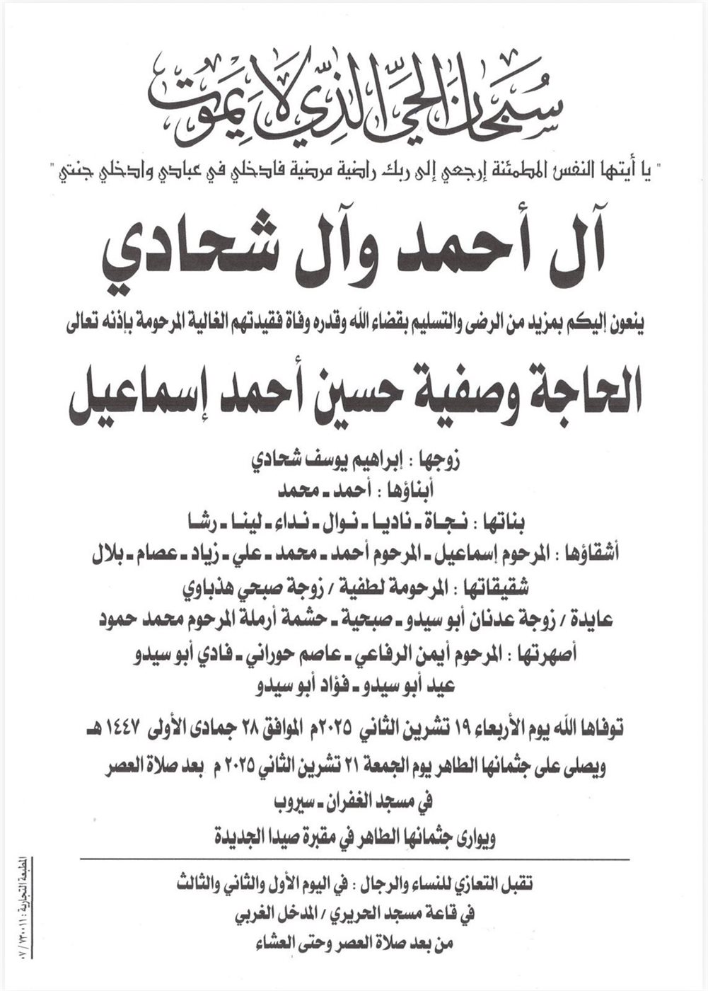 وفاة الحاجة وصفية حسين احمد اسماعيل، الدفن عصر يوم الجمعة في 21 تشرين الثاني 2025 الأربعاء 19/تشرين الثاني/2025 - 04:26 م 11/19/2025 4:26:37 PM شارك