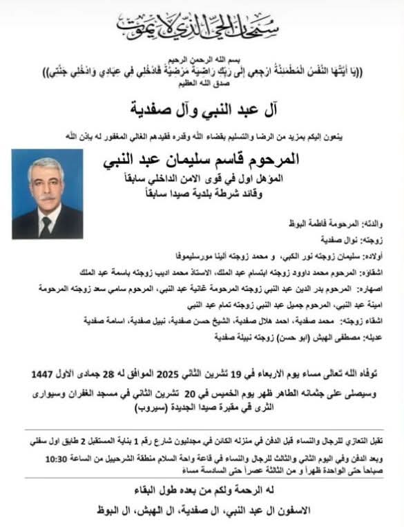 وفاة قاسم سليمان عبد النبي (المؤهل أول في قوى امن الداخلي سابقا)، الدفن ظهر يوم الخميس في 21 تشرين الثاني 2025 الأربعاء 19/تشرين الثاني/2025 - 06:54 م 11/19/2025 6:54:22 PM شارك