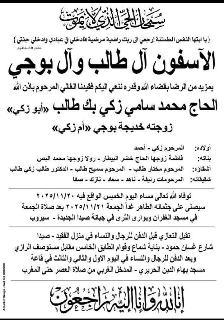 وفاة الحاج محمد سامي زكي بك طالب (ابو زكي)، الدفن ظهر يوم الجمعة في 21 تشرين الثاني 2025 الخميس 20/تشرين الثاني/2025 - 08:11 م 11/20/2025 8:11:04 PM شارك