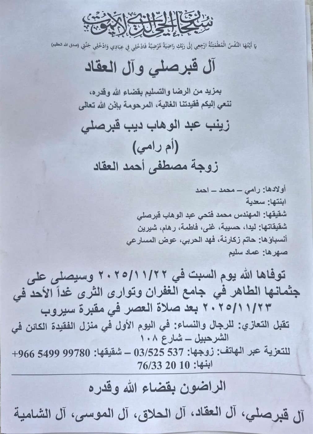 وفاة زينب عبد الوهاب ديب قبرصلي، الدفن ظهر يوم الاحد في 23 تشرين الثاني 2025 الأحد 23/تشرين الثاني/2025 - 11:23 ص 11/23/2025 11:23:41 AM شارك